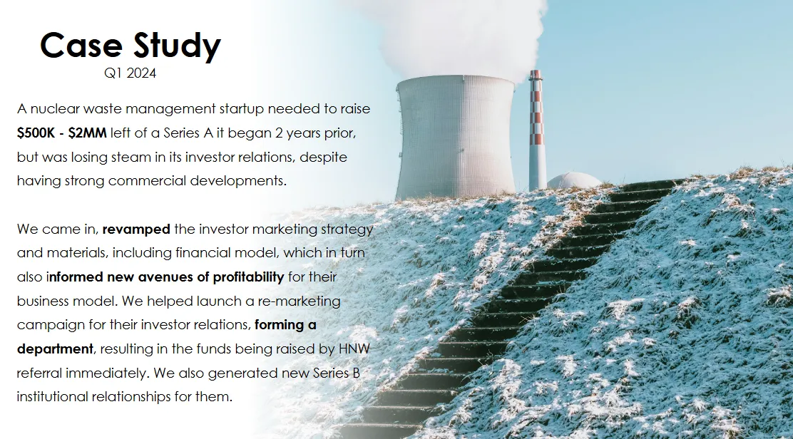 The Result: while the client engaged us as advisor, closed a 6 figure non-dilutive technology grant from a top foundation for its new platform.